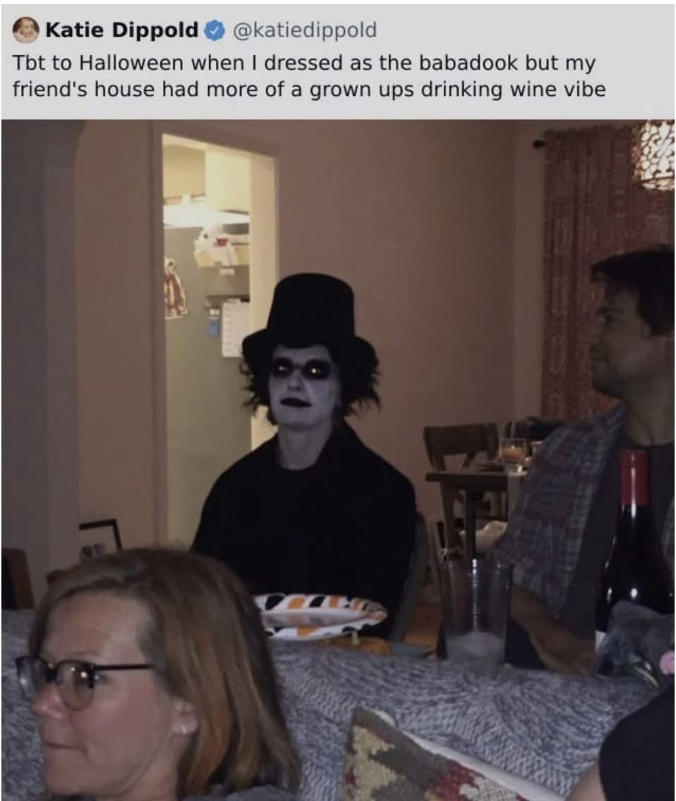 A Twitter post from Katie Dippold @katiedippold with the text “Tbt to Halloween when I dressed as the babadook but my friend’s house had more of a grown ups drinking wine vibe.” The attached picture shows her dressed up in black clothes with a white face and intense black eye makeup. She is surrounded by two people not dressed up and drinking wine.