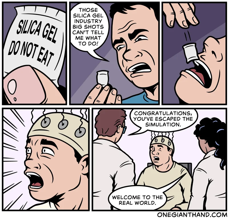 “What do you mean capitalism also exists in the real world? Are you sure we don’t need to eat more silica gel packets? How deep does this shit go?!”