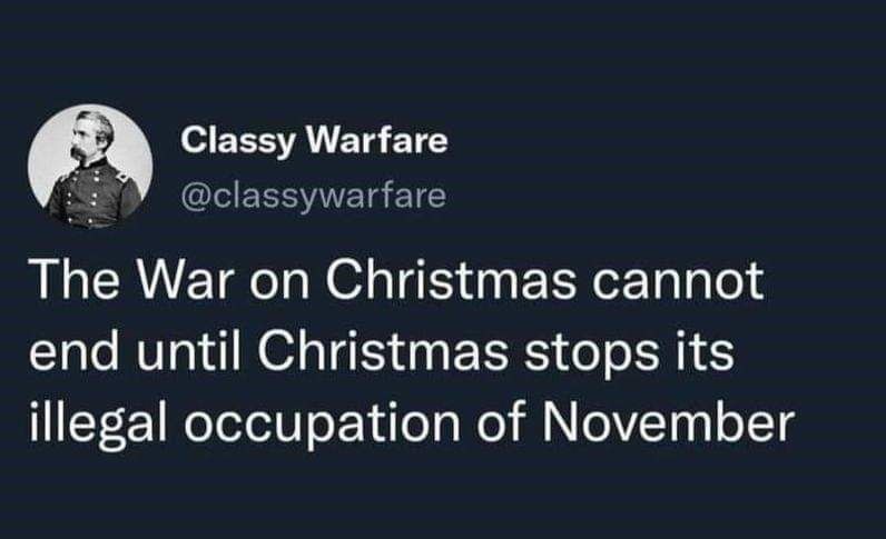 November they started putting Christmas shit out in Walgreens and Walmart in fucking September. By October it was mostly Christmas in most stores.