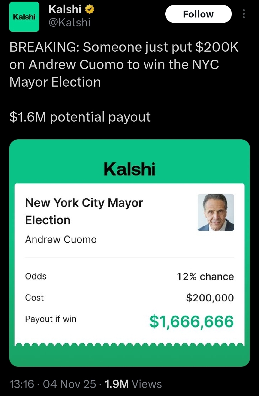 Can someone techy find out what the odds were for Mamdani recently and a few weeks ago? Wondering what money could have been made from a 50-100 buck wager