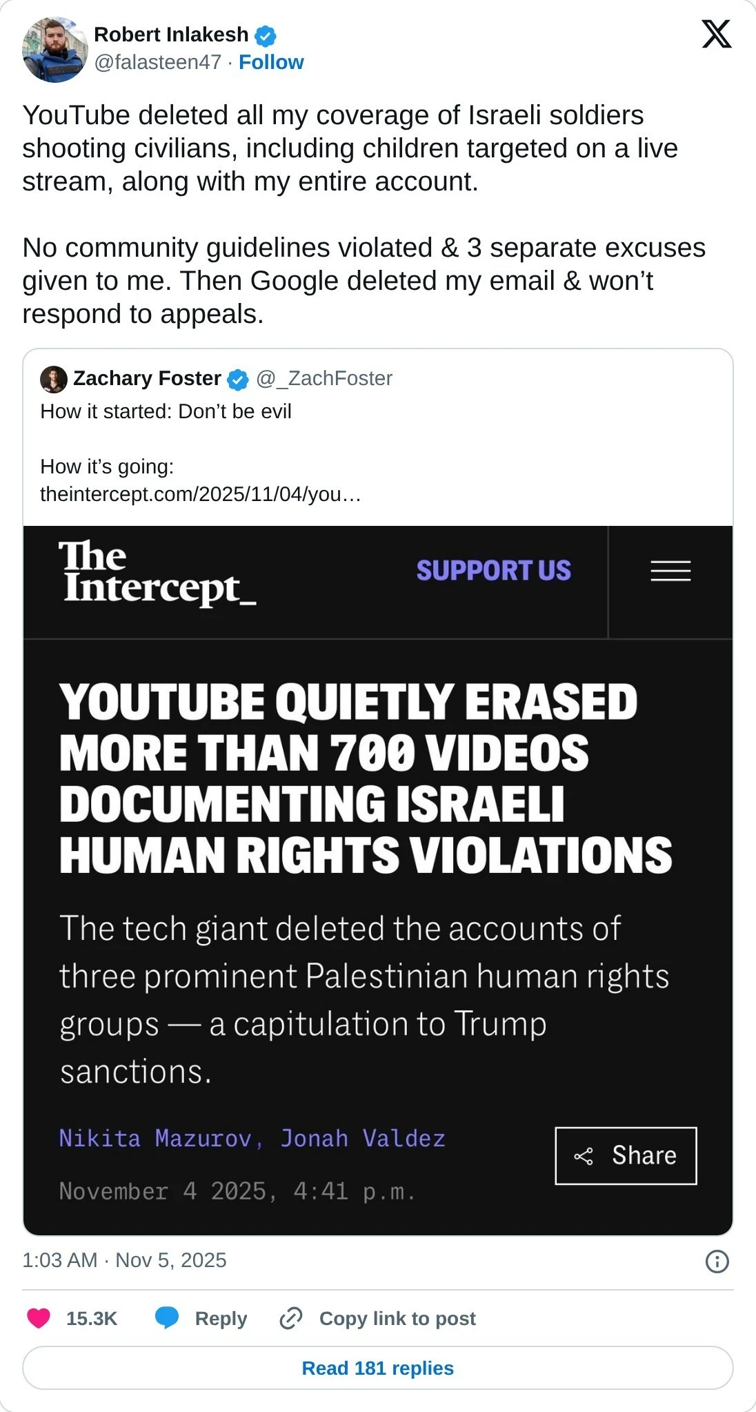 We really live in a world where “YouTube took down my warcrime videos” is bigger news than “there are warcrimes being committed”