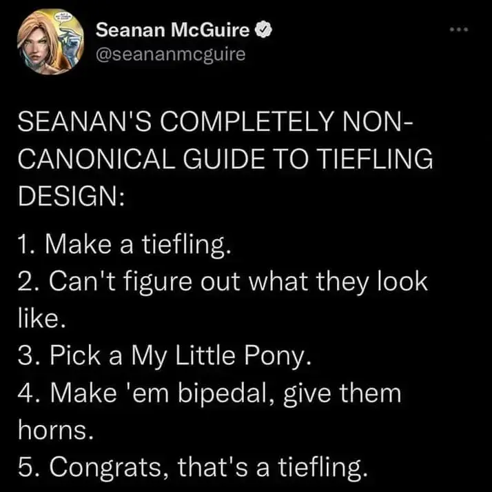 Stamets@lemmy.dbzer0.com to RPGMemes @ttrpg.network · 5 days agoGuide to Tiefling Designlemmy.dbzer0.comimagemessage-square19fedilinkarrow-up1328arrow-down120