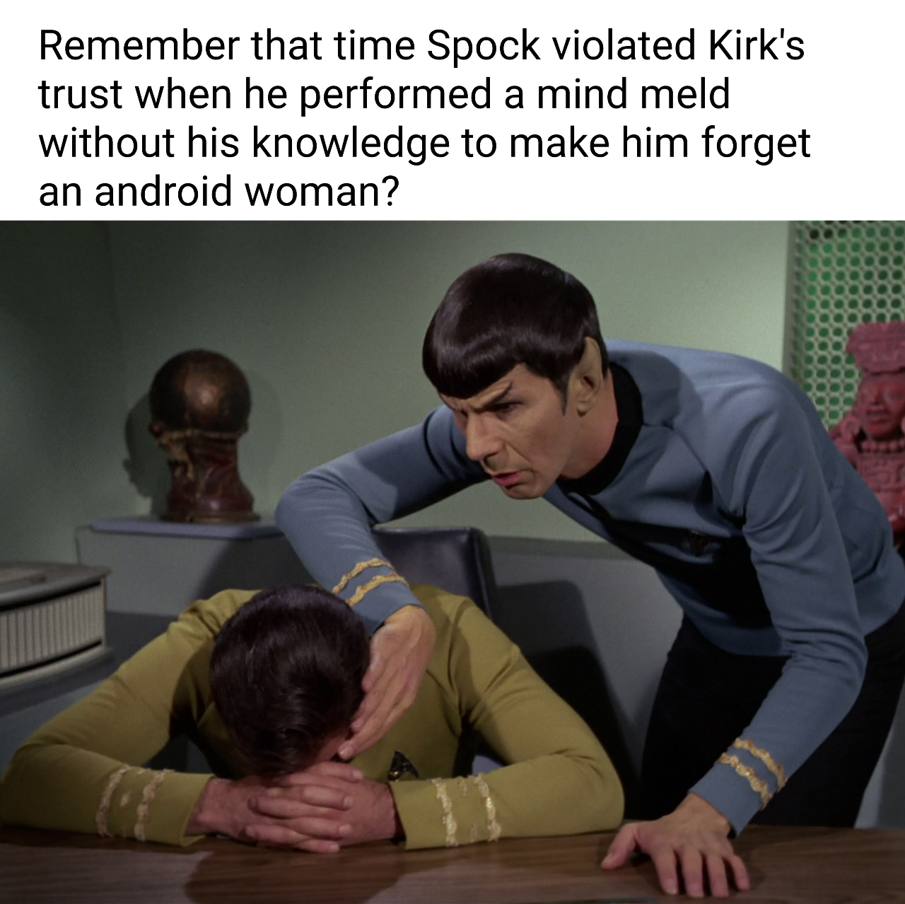 puts on tinfoil hat For the entirety of his journeys, Spock uses his telepathic powers off camera to manipulate his starship captains as useful idiots that can take the fall for any error while he executes his personal agendum