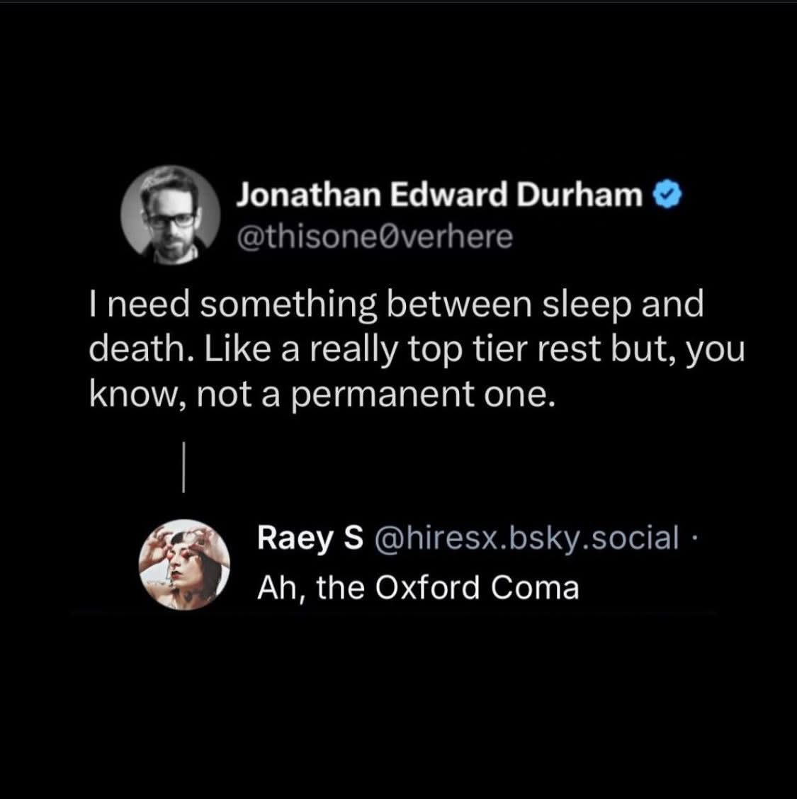 So the responder is extending the joke to make it the Oxford “coma”. Since the original person was asking for a long sleep in between life and death, a coma sorta fits their description.