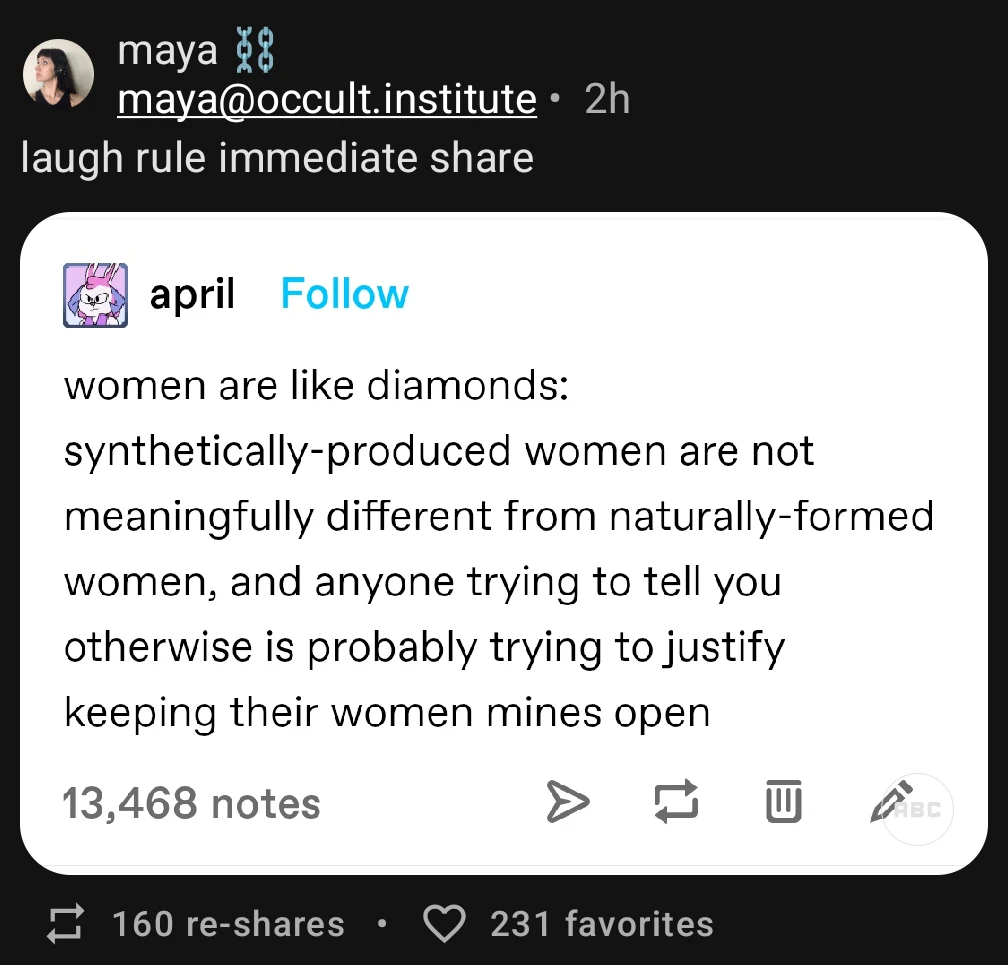 Is it? Where does being able to give birth matter when it comes to the social construct of a woman? There are men, specifically trans men, who can give birth. Conflating the ability to give birth being inherently a feature of a woman is trans masc erasure.