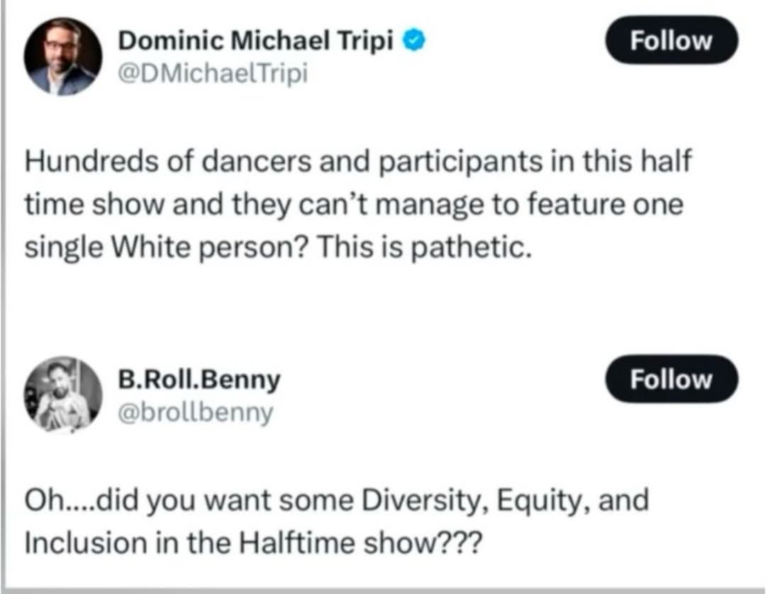 Pretty sure it was Kendrick’s half time show. Because Kendrick is Kendrick, yeah, no shit there’s not going to be a ton of white people. Didn’t go through the lineup or anything, but I don’t think that white people were the only ones excluded either. But he doesn’t care about the lack of Japanese people in the lineup. It’s just another guy that’s normally complaining about DEI, and in this scenario, it really seems like he’d like it, which is hypocritical.