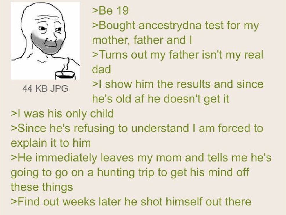 Also “Turned out my father isn’t my real dad” is BS. Genetic test results are useless for determining such.
