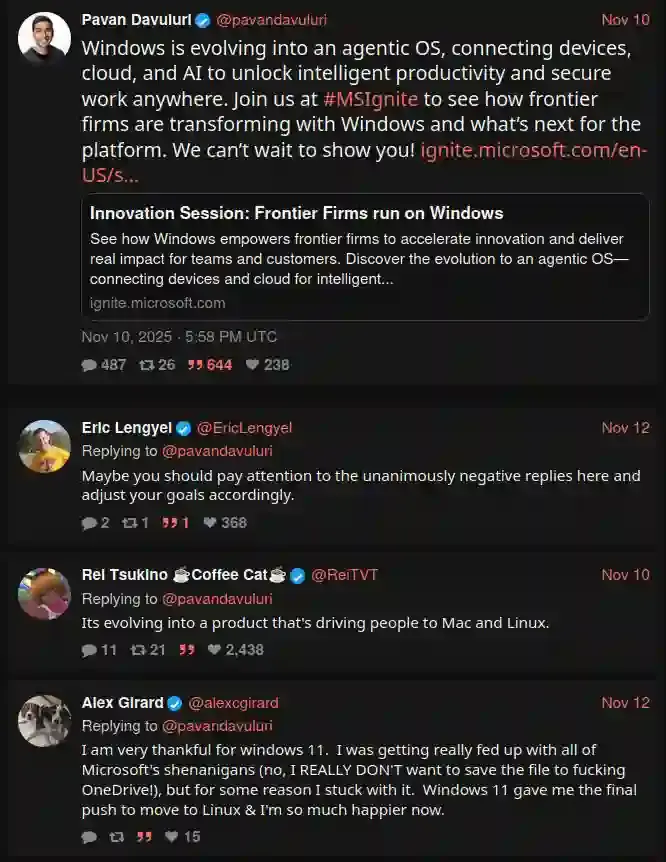 Switching to Linux was so much less effort than I expected, and so much easier than trying to unfuck a new Windows install (which essentially requires pirating an enterprise version to have a chance), and then still have all of your data stolen despite best efforts. So, yeah, thanks Windows 11.