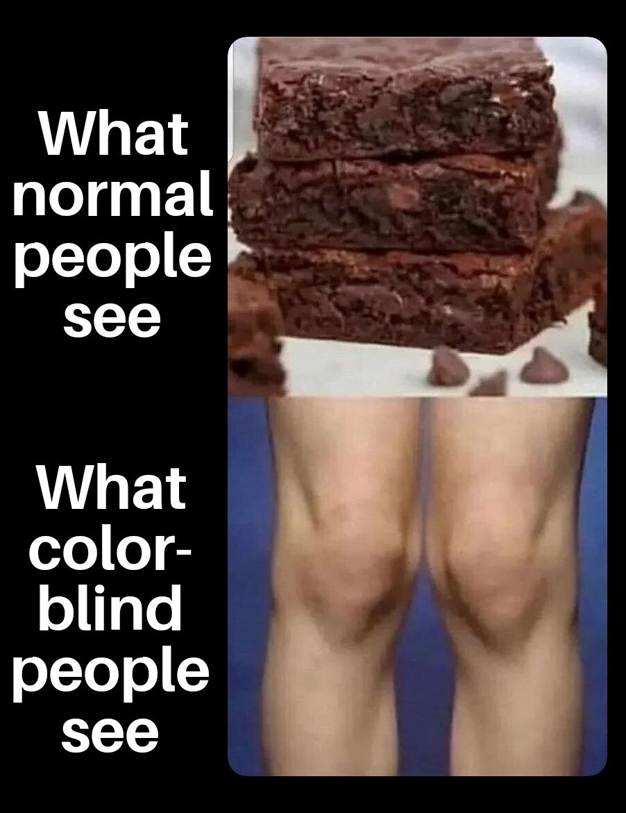 The first picture is brownies. The second picture is knees that are not brown, presumably because color blind people wouldn’t see brown in the world of this joke. It’s not really how color blindness works and, IMHO, not that great of a joke … But you can make it make sense if you try.