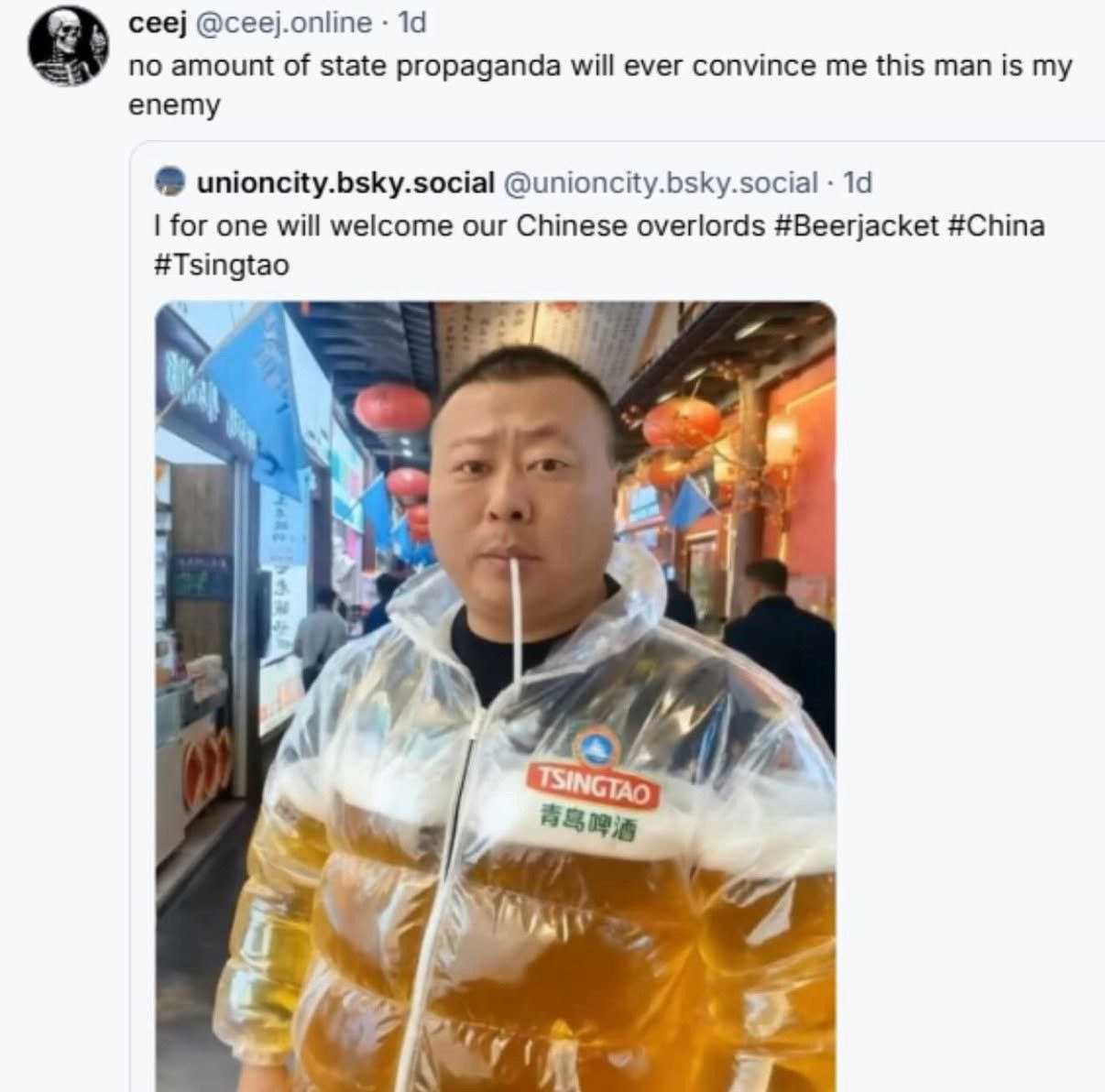 Uh, we’re talking about a beer jacket? You can be the biggest China supporter ever and think that’s such a bizarre idea that it’s probably AI.