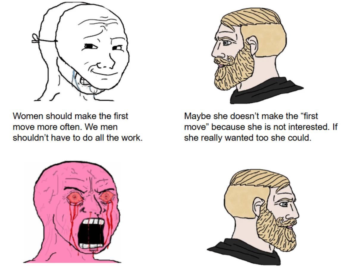 Second of all, what do women like? Say it with me - women like ✨CONFIDENCE✨. Like, for example, the confidence displayed by saying hi to her and asking her out on a date. “Man asks out woman” is one of the most common tropes in the dating dance, and a lot of women like doing that dance. They like a man being a man, and herself being a woman, and each of you playing your roles. Of course not all women are like this, but a lot of women are. Yes, including left leaning, feminist, lgbtq±supporting, Trump-hating women. Complaints about how “women should make the first move more because that would be more fair” will fall flat on their face with these women, because they don’t want to do that.