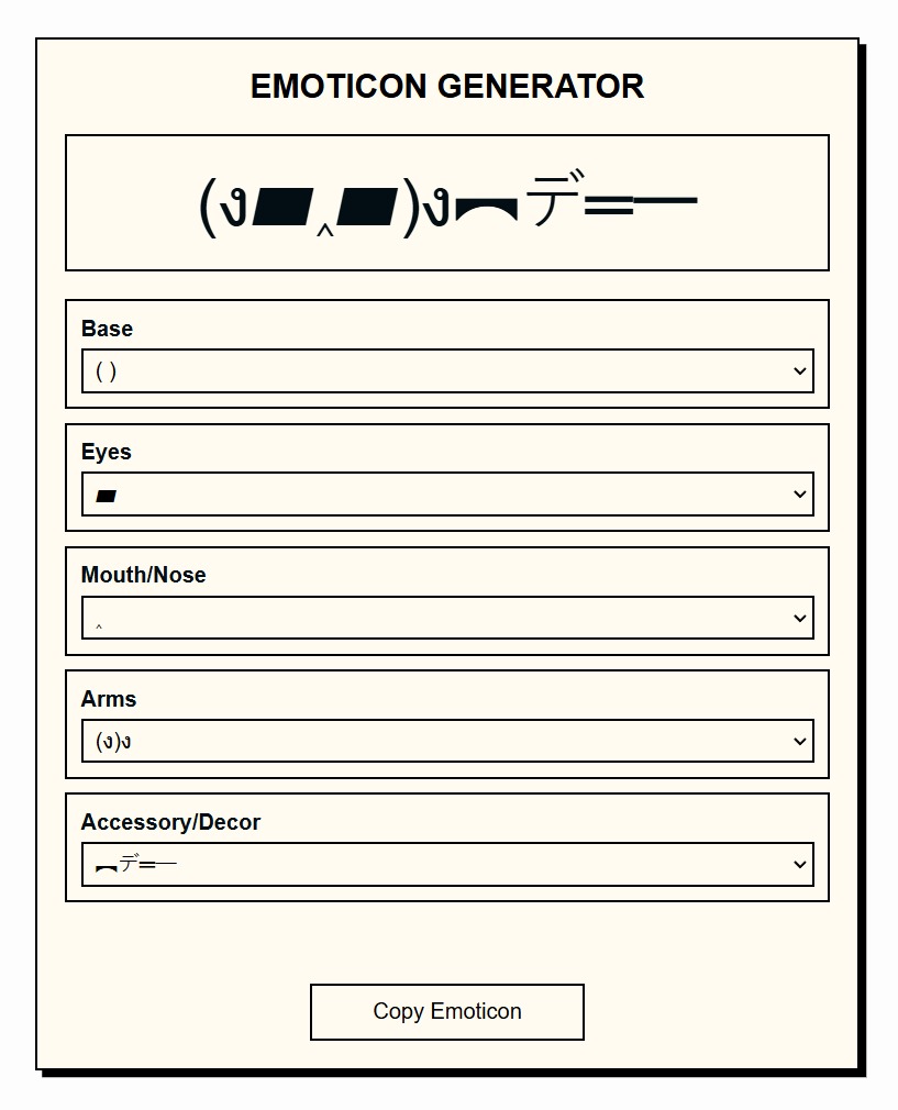 arrow-up14arrow-down1external-linkI Made a Tool to Generate Text Emoticons ¯\(ツ)/¯plus-squareemoticonhub.comAdityaGavit@lemmy.world to The Internet Is Beautiful@lemmy.world · 16 days agomessage-square0fedilink