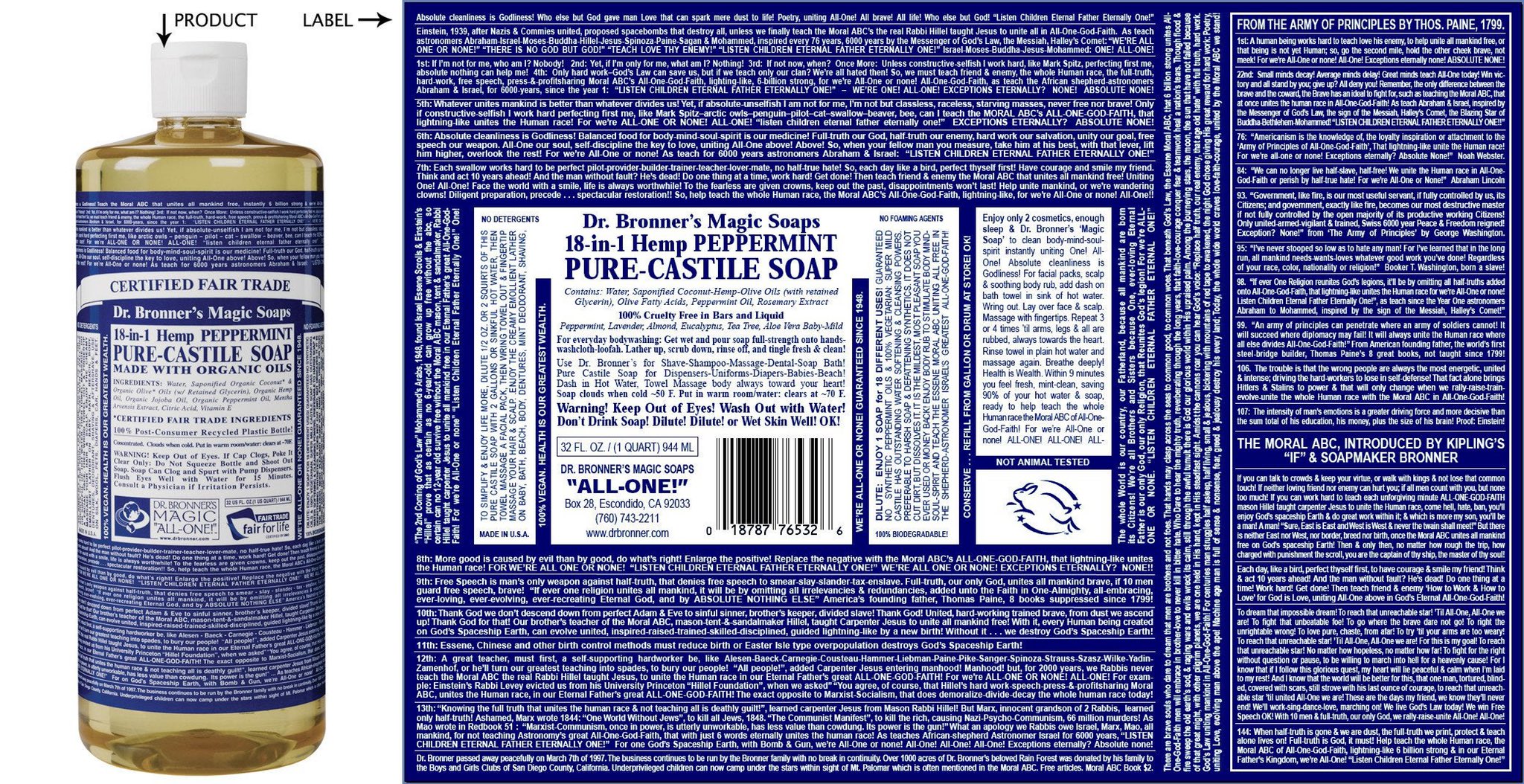 Dr. Bronner’s was founded in 1948 by Emanuel Bronner, a third generation German-Jewish soap maker. He used the labels on his ecological soaps to spread his message that we must realize our transcendent unity across religious and ethnic divides or perish: “We are All-One or None!” The business continues to be run by his family.