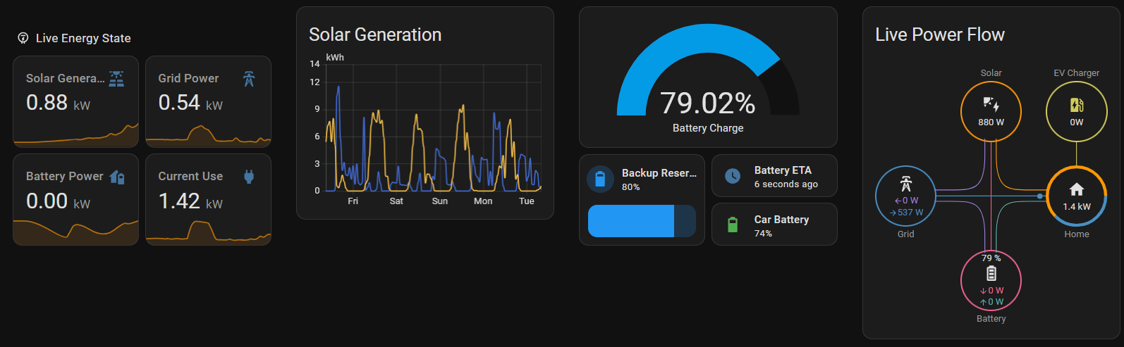 I have the Tesla PW3 providing stats through the Fleet API to Home Assistant, which is where these graphics are from. One of the biggest reasons I’d recommend against Tesla is that you’re dependent on your stats to pass through their cloud API and back to you. If your internet goes down, you lose stats. If Tesla gets annoyed with you, or just decides to stop providing the service, you lose stats. If the PW3 still had a local API like the PW2 did, I’d feel much more comfortable with it. I don’t have a home solar installation so that I can be dependent on some company. For anything, if I can help it.