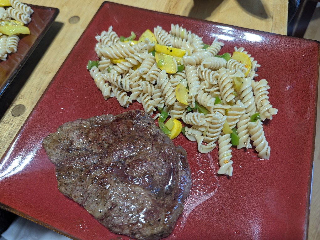 The pasta salad was made from free pasta, garden banana pepper, bell pepper and squash. So basically only cost the red wine vinegar, olive oil. I did this the squash and peppers in the wok to cook them to tone down the proper bite and cook the squish.
