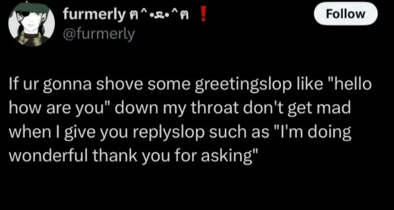 Slop seems superficially different but structurally the same. But structurally different is the goal. We invite people into a new structure, such as solar punk, by living it’s principles. But is the argument for not being superficially different so you can be relatable to the average person? So you escape detection from the state apparatus? So it projects a deep root confidence that some might find alluring?