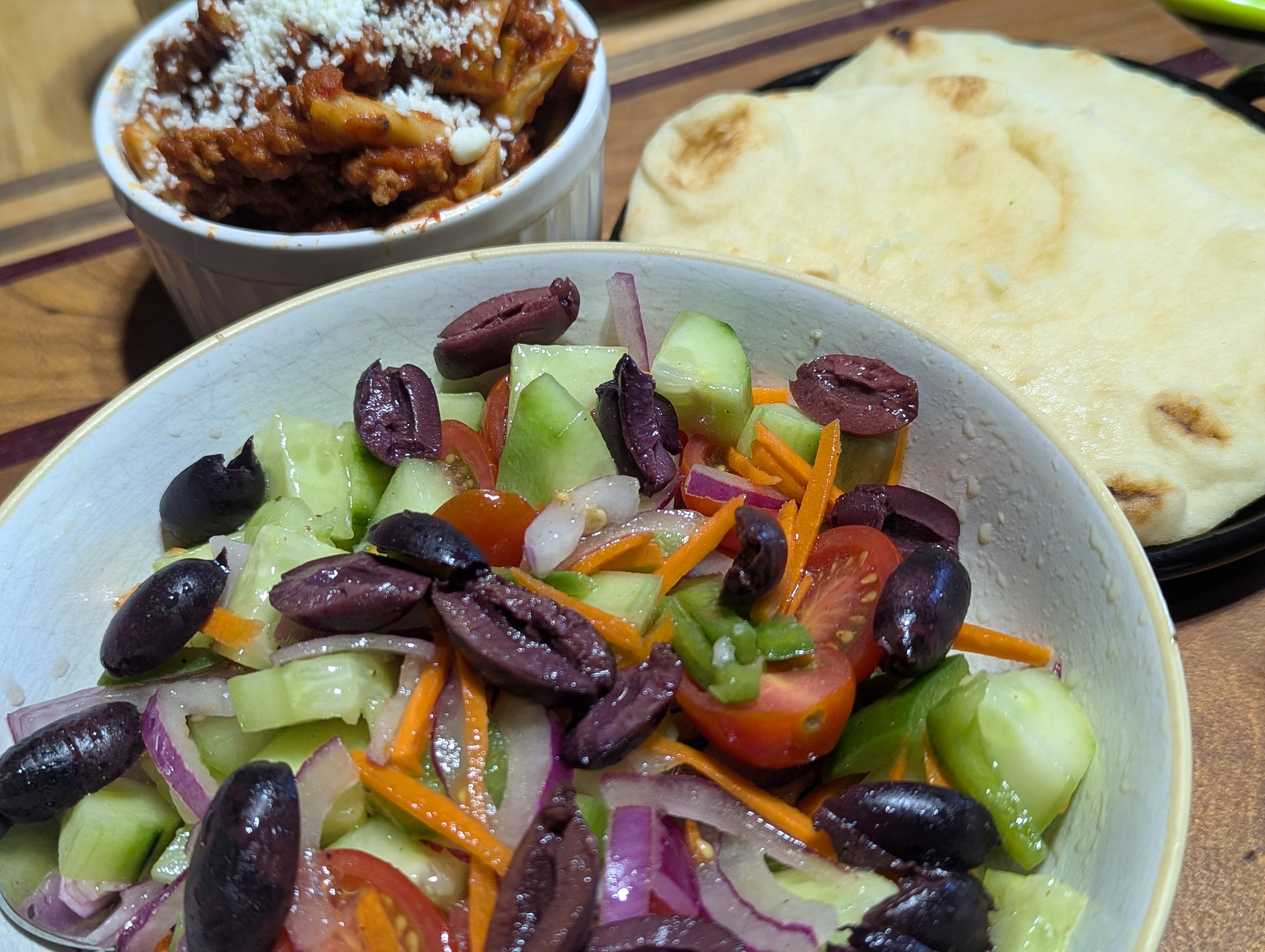 Side of naan bread cuz I couldn’t get pita bread side of leftover spicy Italian pork sausage pasta. Homemade Greek salad dressing.