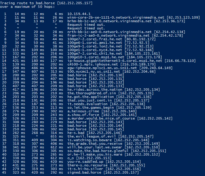 This is real, try it for yourself: Windows: tracert -h 100 bad.horse Linux: traceroute -m 64 --resolve-hostnames bad.horse