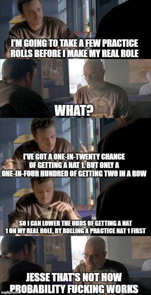 That’s very interesting to me (I am a bit mathematically illiterate when it comes to probability). Wouldn’t it still have a lower chance of being a 1 if you said you want your second roll to be the one that counts beforehand? Or would different permutations screw with the odds, say rolling a 12 then a 1, rolling a 15 and a 1, etc, counting towards unfavourable possibilities and bringing it back to 1/20?