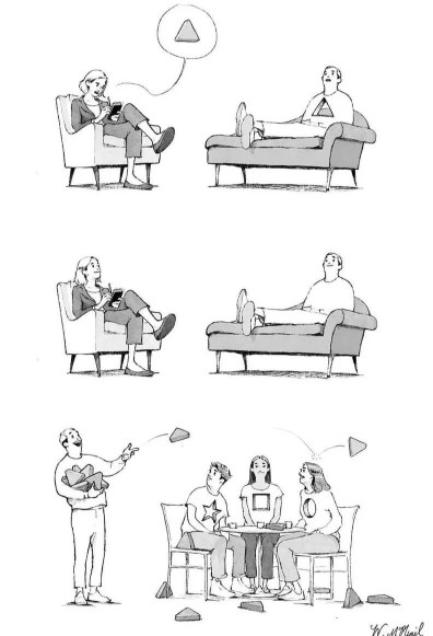 To me it looks like he’s throwing triangles around without actually caring about what kind of help the other people need. If he was just sharing and trying to be helpful, we wouldn’t see a triangle bouncing off his friend’s (?) head with many more scattered about. His intentions are probably good, but that doesn’t mean his type of help is wanted by them.
