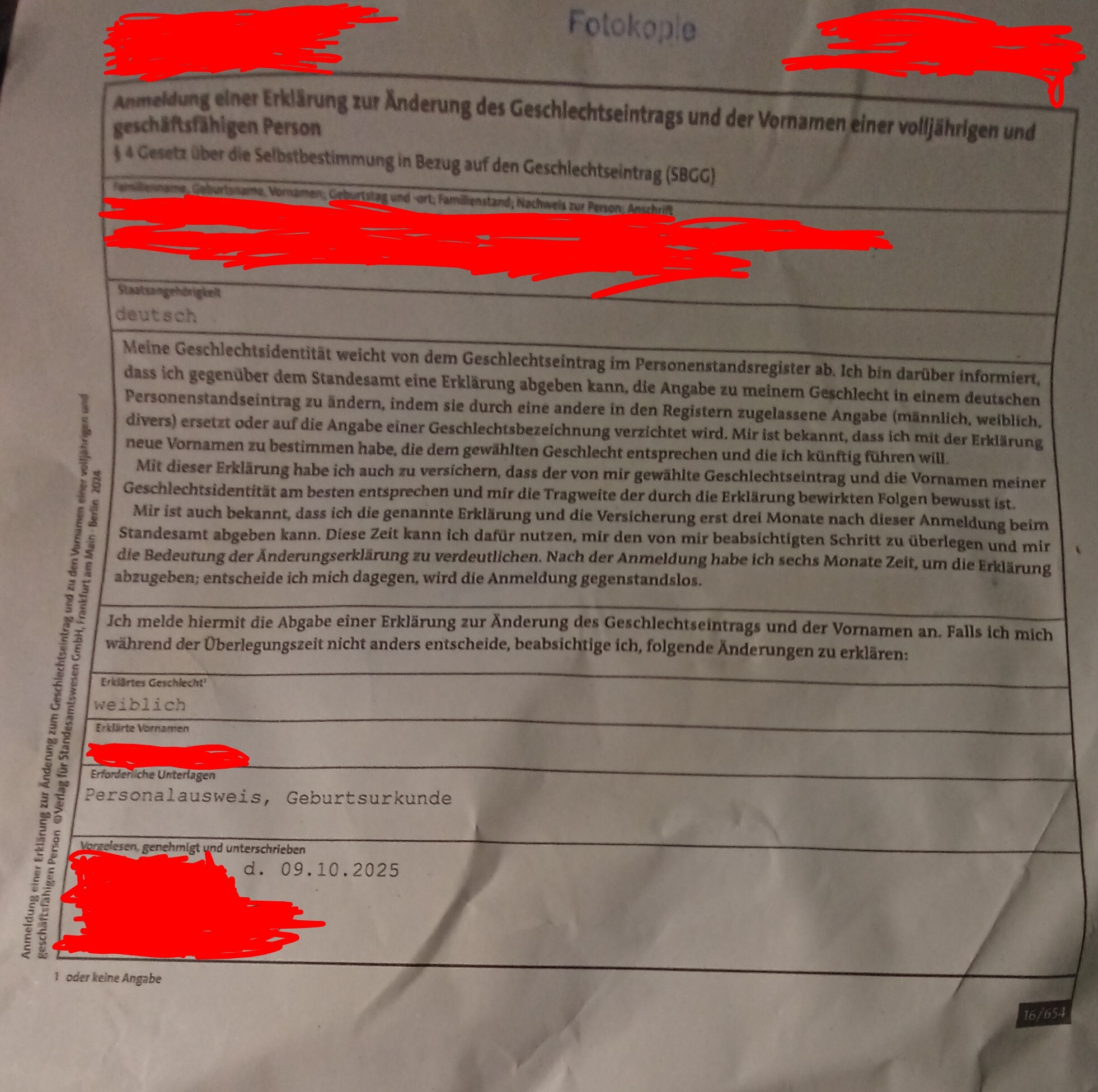 Zu sehen ist das tolle Schreiben, dass ich bekommen habe weil ich heute beantragt habe, meinen Namen und Geschlechtseintrag ändern zu lassen.