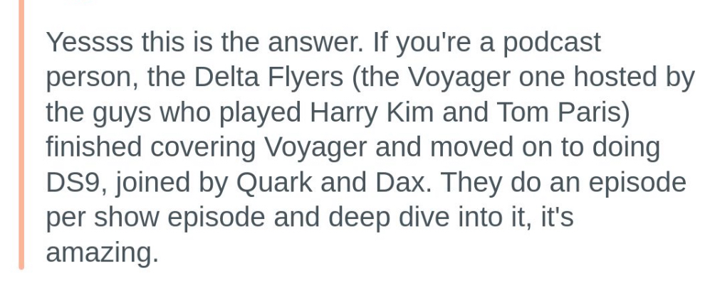 If y’all like Star Trek podcasts, I do like what the team at greatest gen puts out. Especially the TNG stuff.