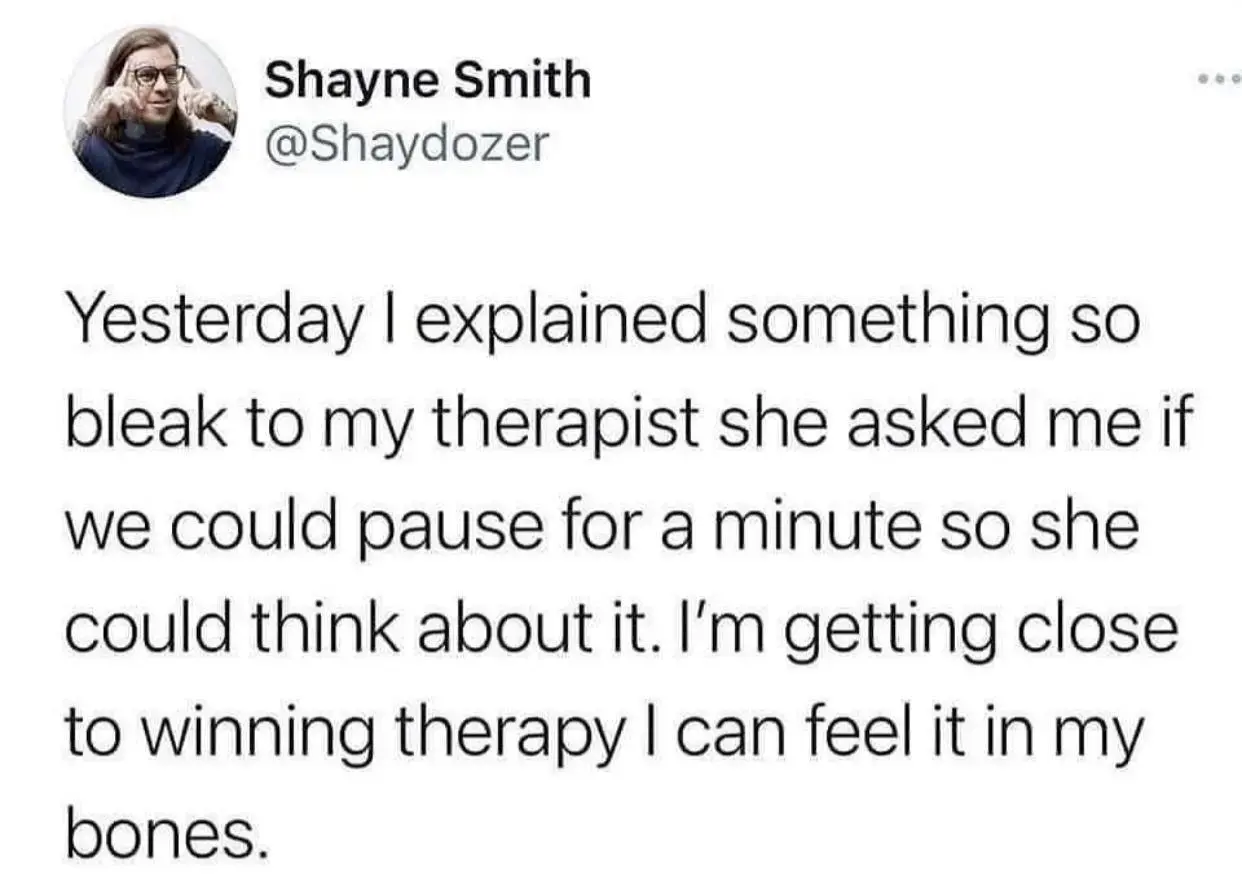Yeah “winning therapy” is a running joke in mental health communities because a lot of millennials who need therapy struggle with the need to achieve in all aspects of life
