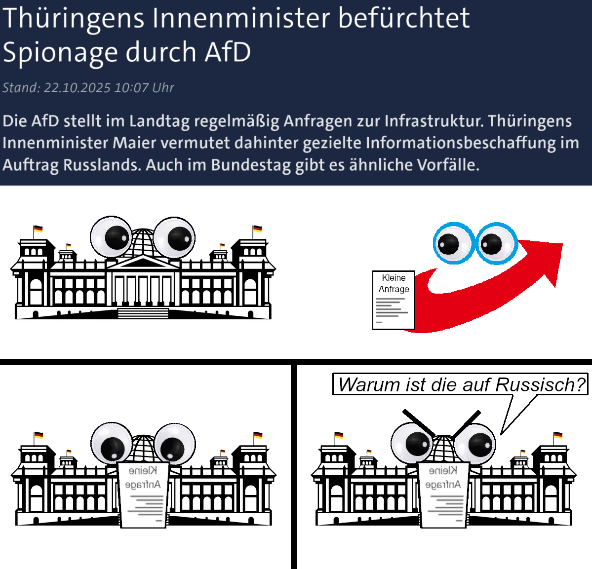 Ich nehme der AfD ab, dass sie genug Prepper in den eigenen Reihen hat, dass die Anfragen so detailliert sind, genauso wie es sicher russische Spione gibt. Andererseits wird die Regierung auch jede Chance nutzen, die AfD als Werkzeug Russlands hinzustellen.