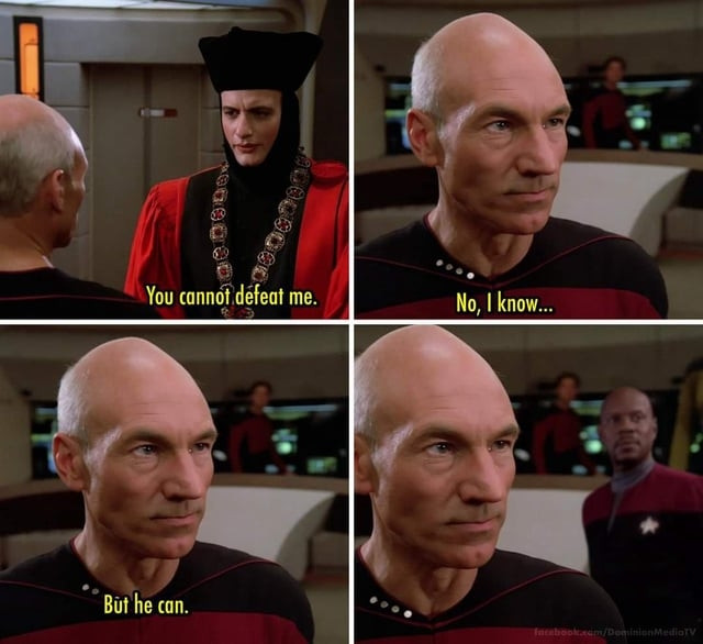 minus-squareThebeardedsinglemalt@lemmy.worldlinkfedilinkarrow-up26·3 days agoWell they did want to set DS9 apart from TNG. So having a captain totally cool with punching Q set the stage. Of course, I believe right after that episode Q went straight back to go annoy Picard.
