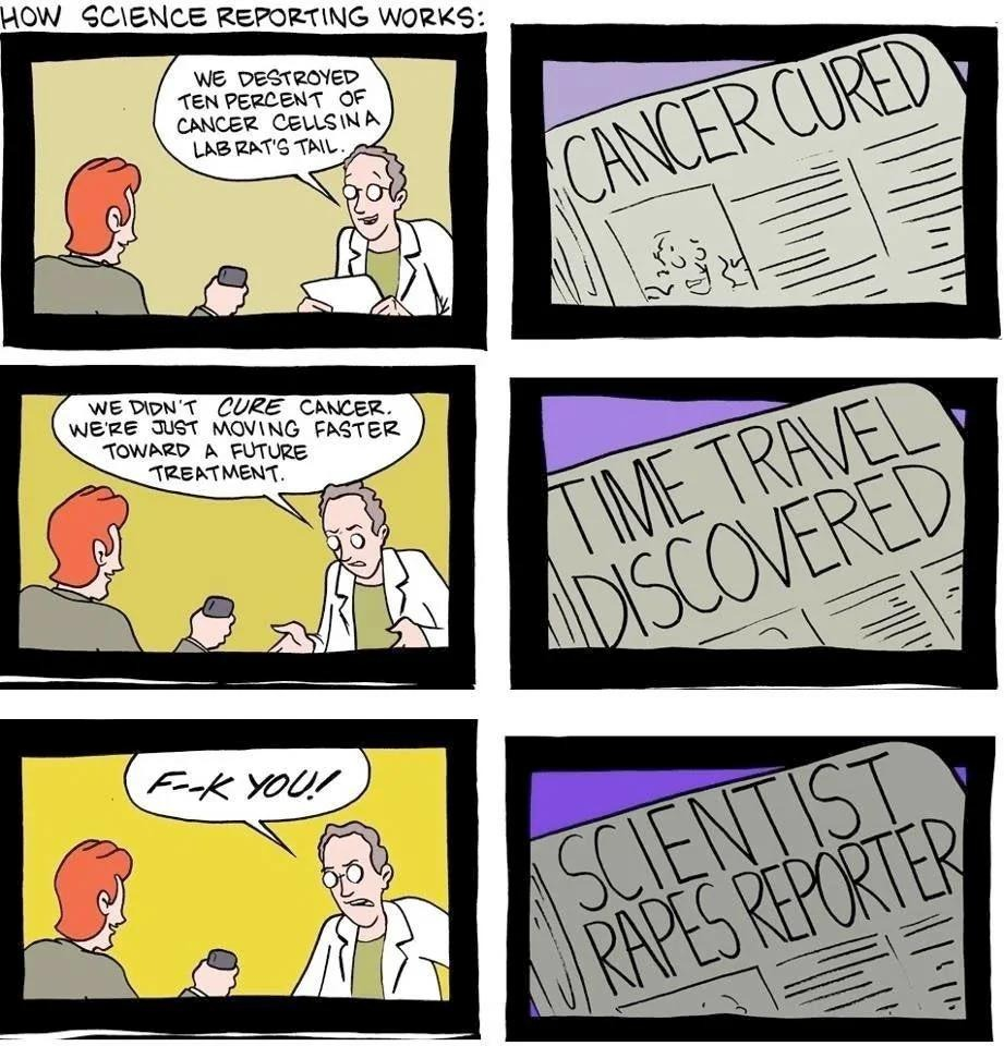 The media does not want to write about incremental discoveries so instead they make up sensationalist headlines and then clarify in the body of the work. Knowing full well that a lot of people won’t read beyond the headline.