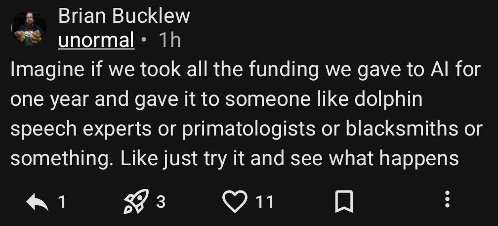 But like honestly though, I’ve seen on YouTube people funded almost entirely through commissions and patrons manage metallurgical feats previously considered impossible like the forge welding of titanium to steel. Imagine what they could do with even a fraction of Nvidia’s or OpenAI’s budget?